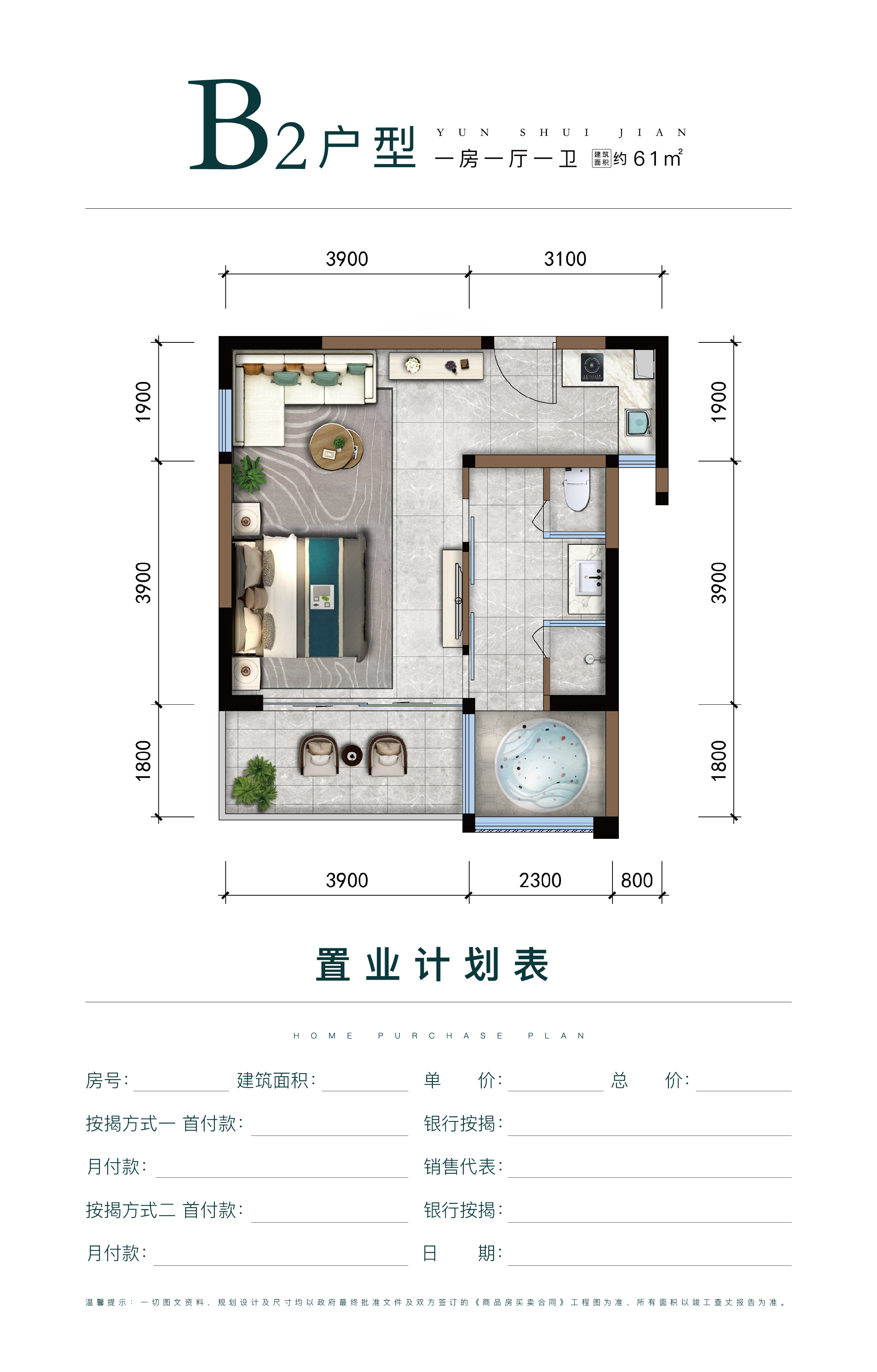 61平一房一厅舒适惬意,功能区域布局合理,客厅主卧自由切换,带来真正度假感受